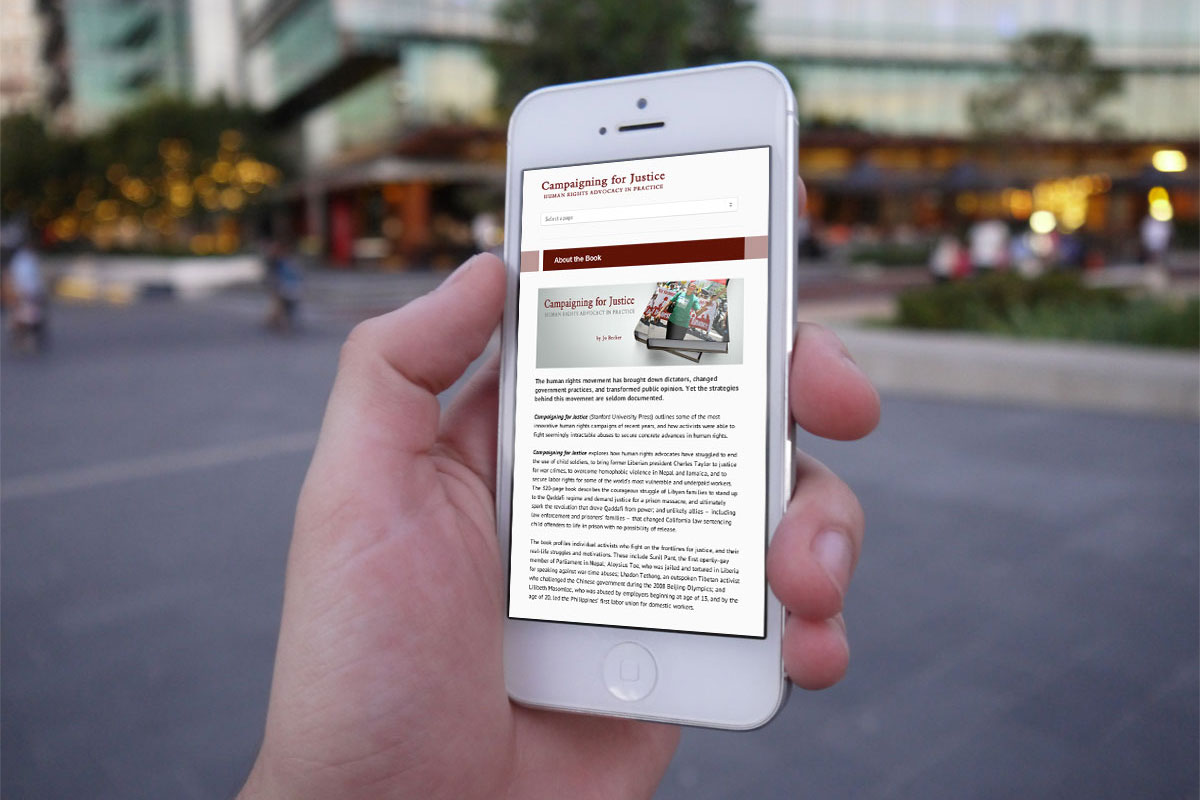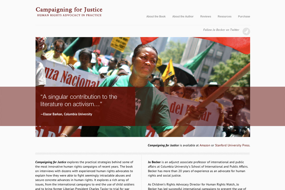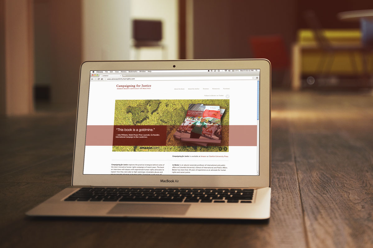 Author and Professor at Columbia University’s School of International and Public Affairs, Jo Becker asked hmmbird Design for a very minimal and clean website to promote her book Campaigning for Justice. Jo provided the written content and her photo. The project involved creating book mockups, a banner, photo editing, and web design. The site is a small customized WP theme to promote her book and is responsive for best reading on all devices.