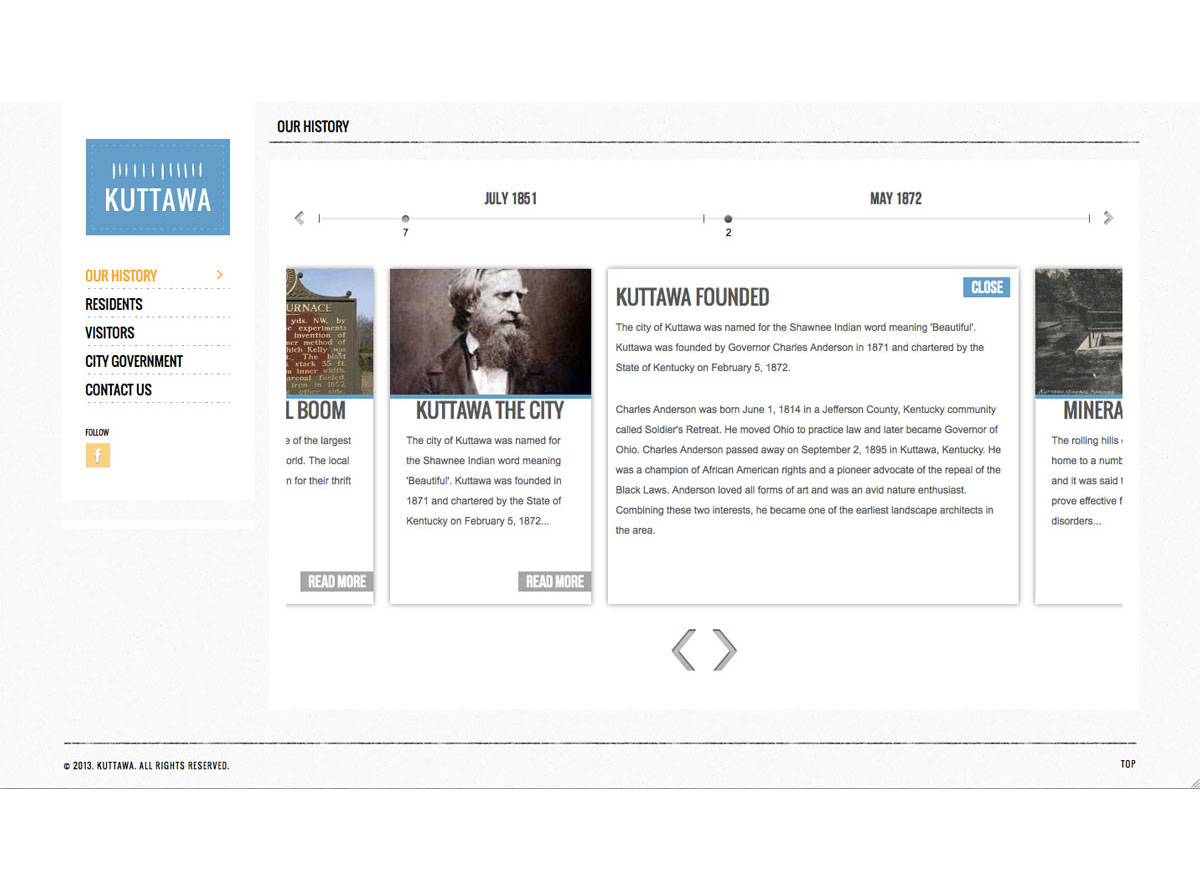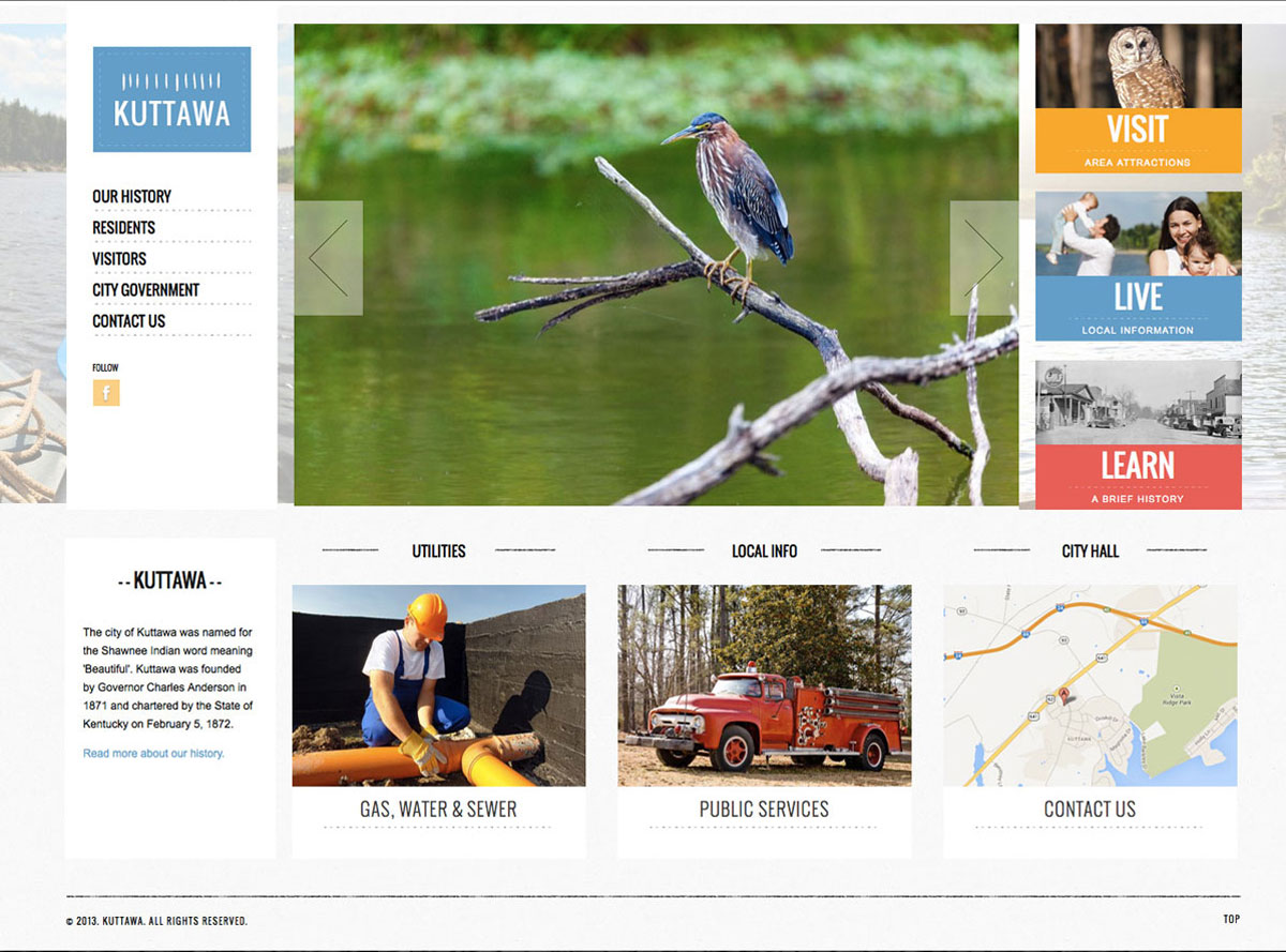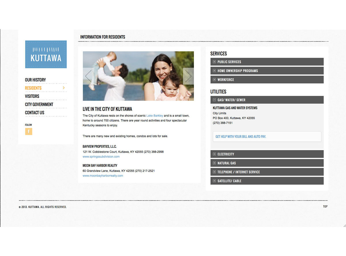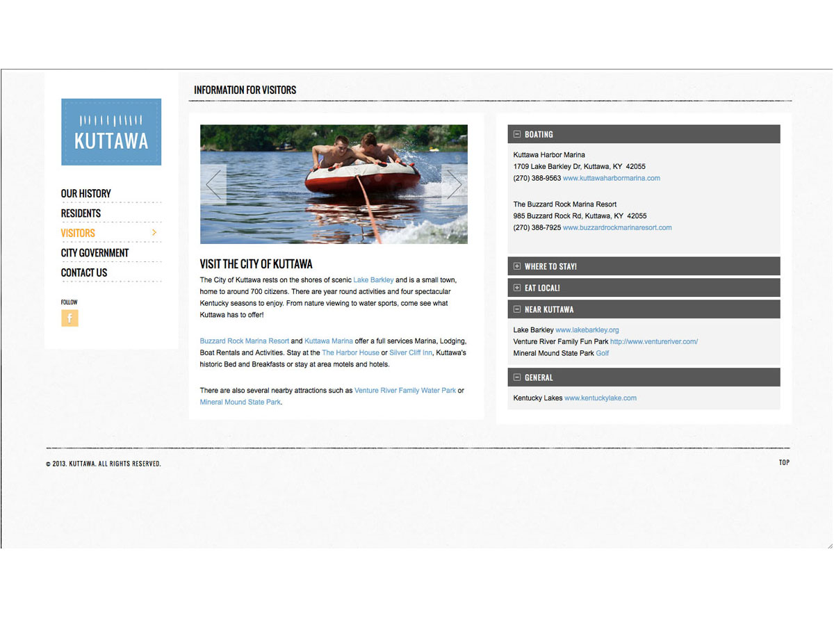 Kuttawa is a small town in Western Kentucky that was relocated in the 60s as a result of dam construction on the Cumberland River at Grand Rivers. The town has been rebuilding its economy to promote tourism and water activities on Lake Barkley. HBD was approached by a small design agency in Kuttawa, Kentucky to create a web redesign for their city government’s website to promote recreation and serve as a reference for residents.